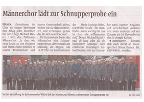Gemeinsam im Chor zu singen bereichert den Alltag jedes Einzelnen bei uns, so Michael Hartel Chorleiter des Dülmener Männerchor e.V. „In dem wir neue Leute zu uns einladen und ihnen einen Einblick in unsere Probenarbeit und unsere Gemeinschaft geben, wollen wir sie dazu motivieren und ermutigen, genau das auch für sich zu entdecken.“ Michael Hartel weiter: „Ganz wichtig bei uns ist, dass alle willkommen sind. Egal, ob jung oder alt, ob Anfänger oder erfahrener Chorsänger – jeder kann vorbeikommen und mitsingen!“