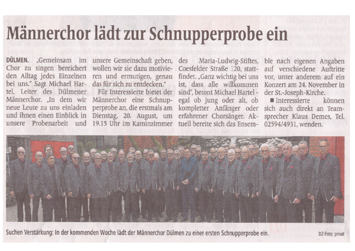 Die offene Probe findet erstmalig am Dienstag, den 20.08.2024 um 19.15 Uhr im Kaminzimmer des Maria-Ludwig-Stiftes, Coesfelder Str. 120 in Dülmen statt. Interessierte können sich auch gern auch nach dem 20.08.2024 direkt an den ersten Teamsprecher Klaus Demes Tel. 02594/4931 und an alle anderen Sangesbrüder wenden oder einfach Dienstags um 19.15 Uhr zur Probe erscheinen.
